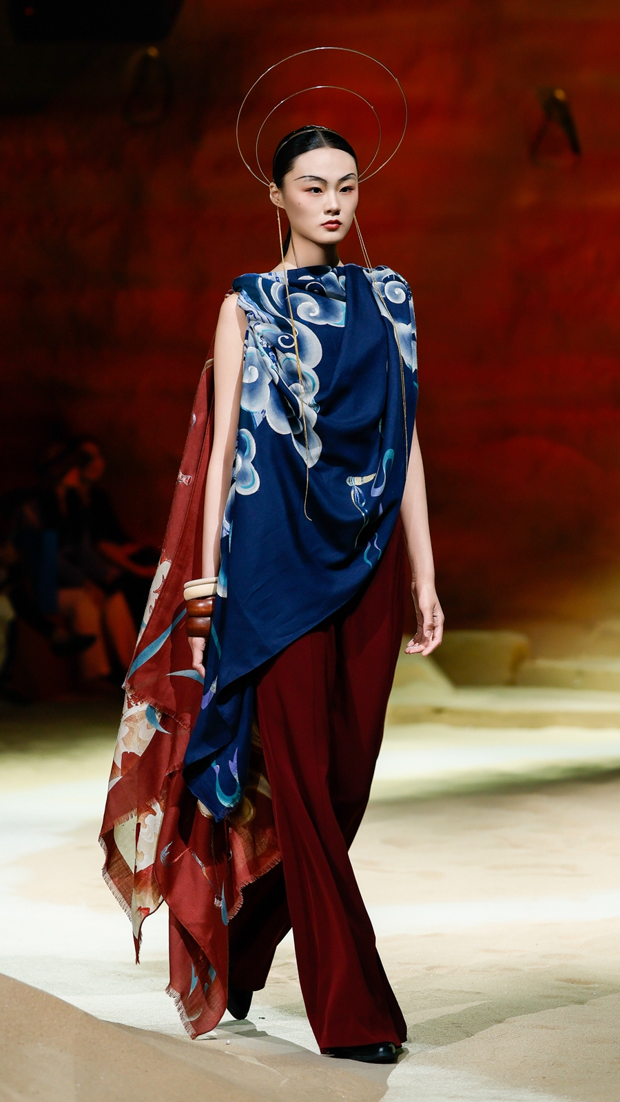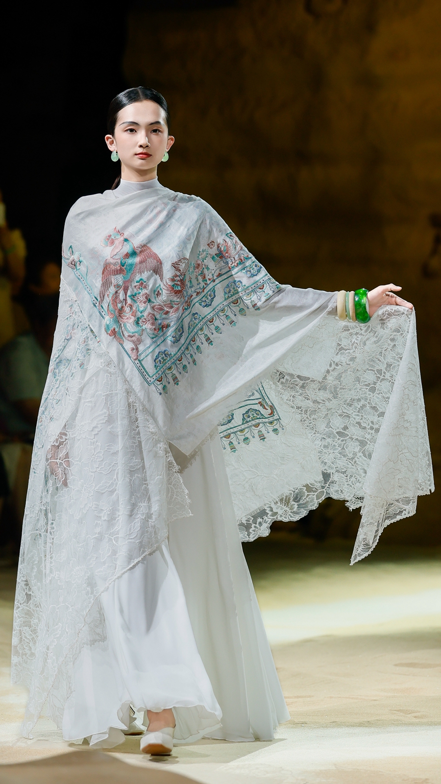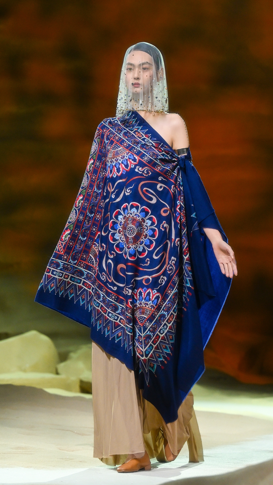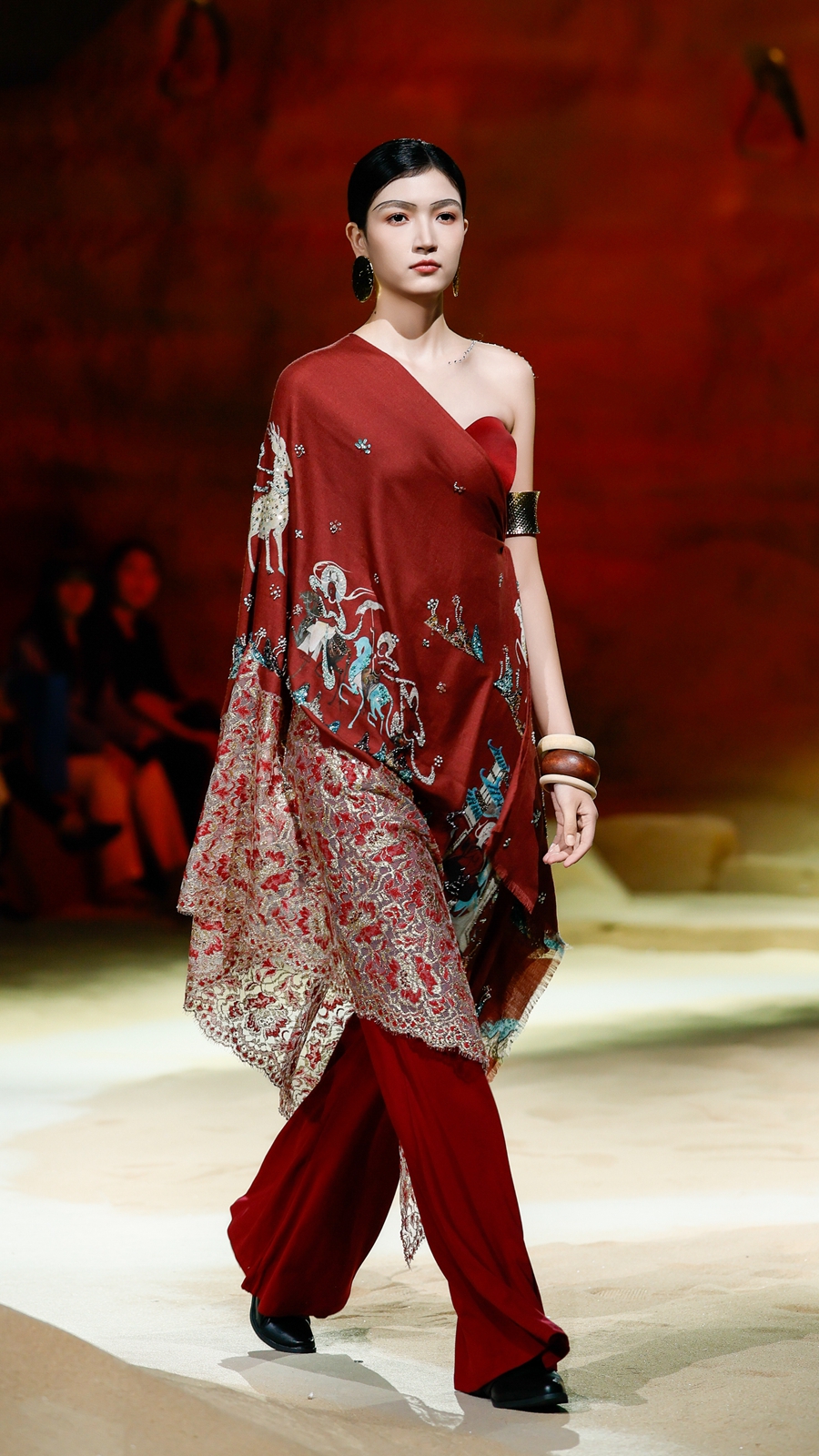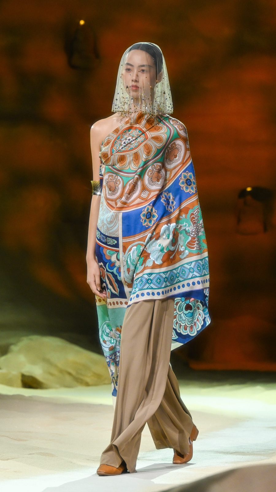 嫵WOO 2026春夏典藏大秀在上海文化地标「上生·新所」拉开帷幕,于百年建筑中辟出一方大漠梵境,穿过沙丘,别有洞天,一窟一龛,壁映千佛。秀场空间通过艺术置景与光影设计,致敬敦煌石窟艺术,旨在消弭时间的藩篱,将尘封的文化记忆具象化,让观者身临其境沉浸式感知体验,构建起当代语境与古老文明之间的连结。